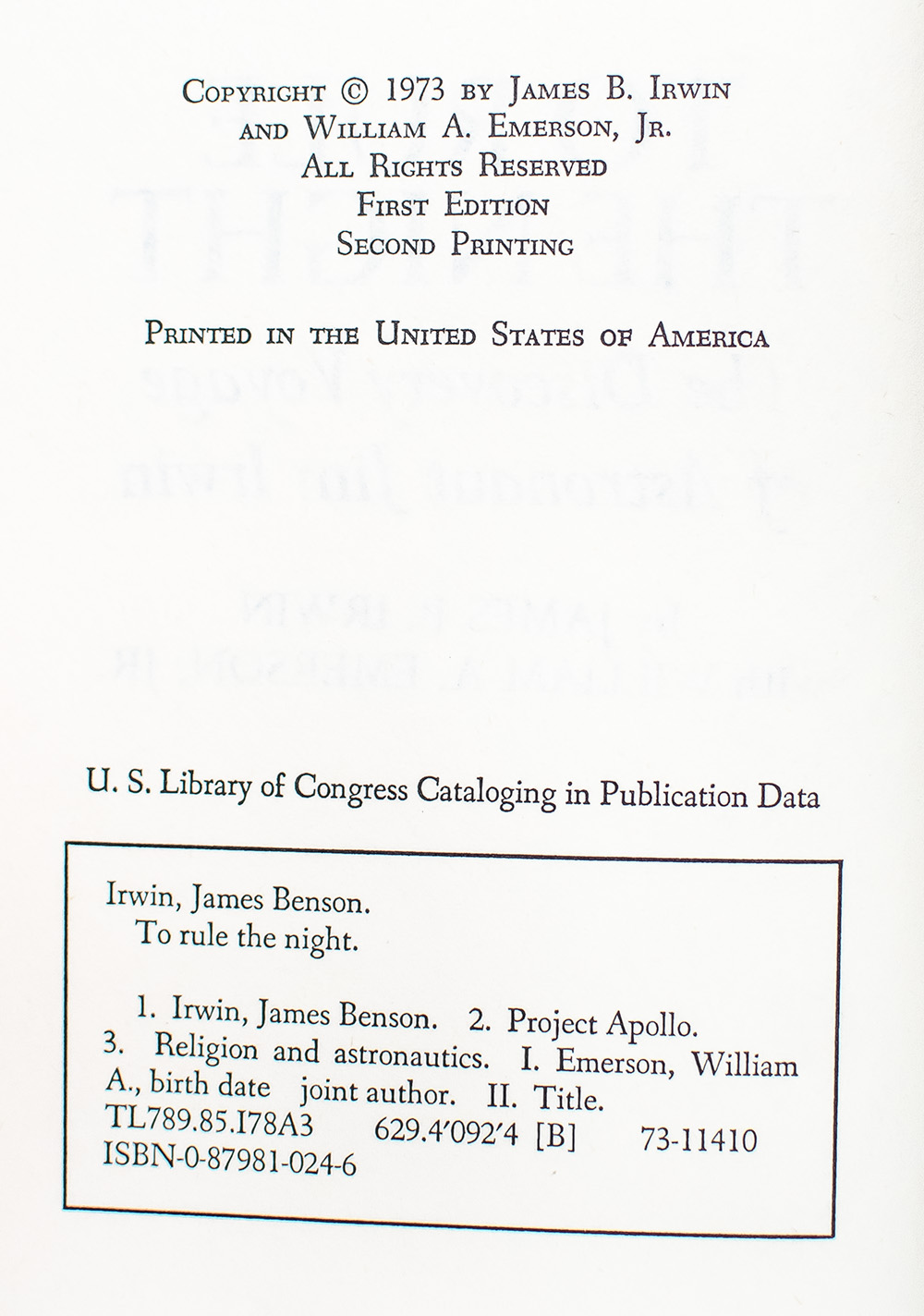 First edition of To Rule the Night; inscribed by Jim Irwin