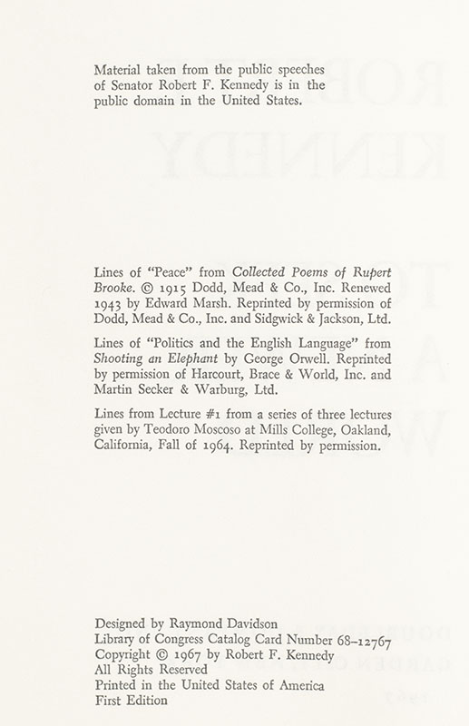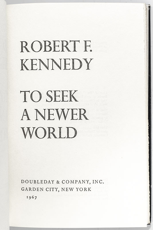 First edition of Robert Kennedy's fourth book. Octavo, original cloth. Presentation copy, inscribed by Ethel Kennedy on the half-title page, "For Mr. Newman, With warm wishes Ethel Kennedy." Near fine in a near fine dust jacket with light rubbing. Jacket photograph by Lawrence Fried.