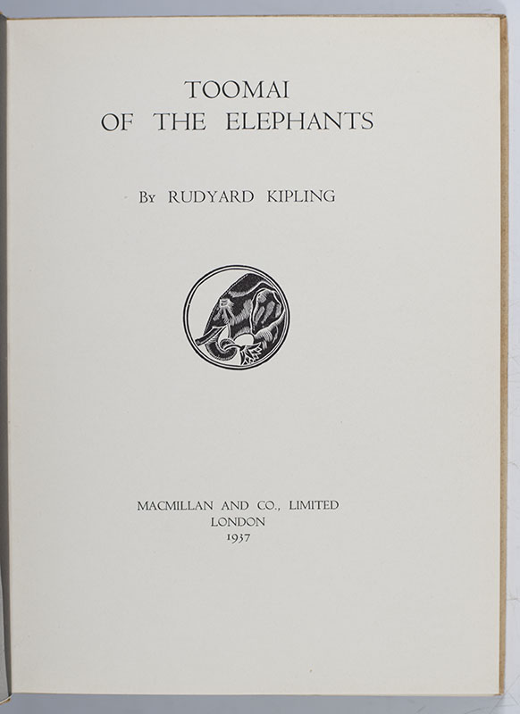 First separate edition Kipling's story of Toomai, a young elephant-handler, the basis for the 1937 film "Elephant Boy" starring Sabu Dastagir, India's first child actor. Octavo, original boards, illustrated with photographs from the film by Mrs. F. H. Flaherty. In good condition. Ownership inscription.