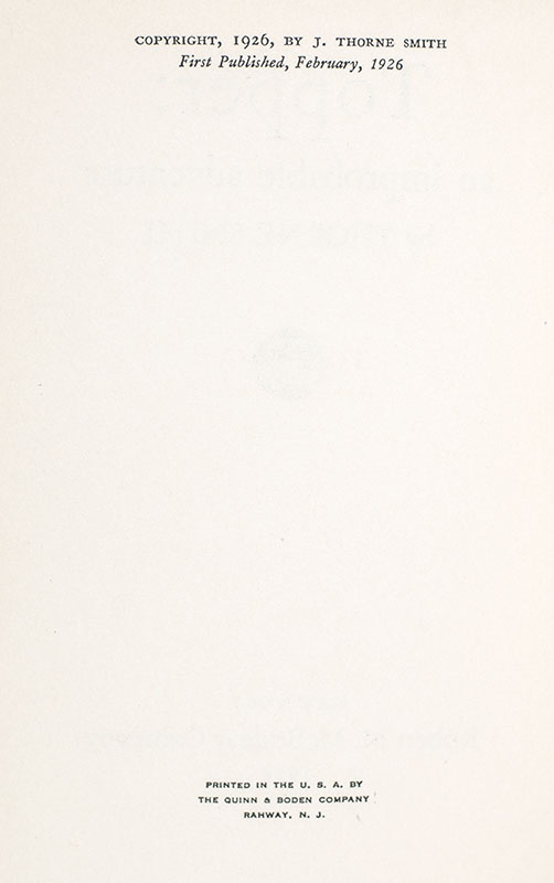 First edition of Thorne Smith's best known work, adapted into the 1937 film starring Cary Grant and Constance Bennett. Octavo, original cloth. Presentation copy, inscribed by the author on the front free endpaper, "To Ralph Blanchard from Thorne Smith." Very good in the rare original dust jacket which is in very good condition. Rare and desirable signed.