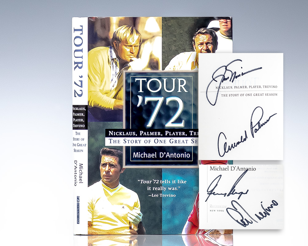 First edition of this work on the magical year 1972 golf season. Octavo, original boards. Boldly signed by golfing legends Arnold Palmer, Jack Nicklaus, Gary Player and Lee Trevino. Fine in a fine dust jacket. Jacket design by GTC Art & Design. Rare and desirable signed by these legendary golfers.