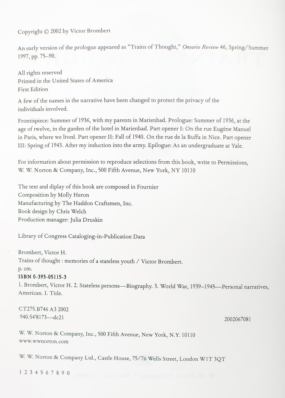 First Edition of Trains Of Thought: Memories Of A Stateless Youth; Warmly Inscribed by Victor Brombert