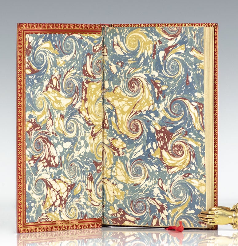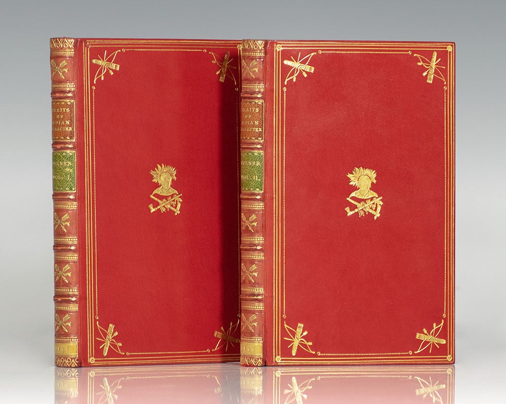 First editions of this collection of Indian customs, including Chippewa, Osage, Pawnees, Senecas, Indians of California. Octavo, 2 volumes, finely bound in full polished red calf by Root & Son, gilt ruled and stipple borders, quiver, bow, and arrow gilt corner devices, Native American portrait with crossed pipe and hatchet at centers, gilt titles and tooling to the spine, raised bands, morocco labels, gilt dentelles, marbled endpapers, top edges gilt, custom slipcase. In near fine condition. An exceptional example.