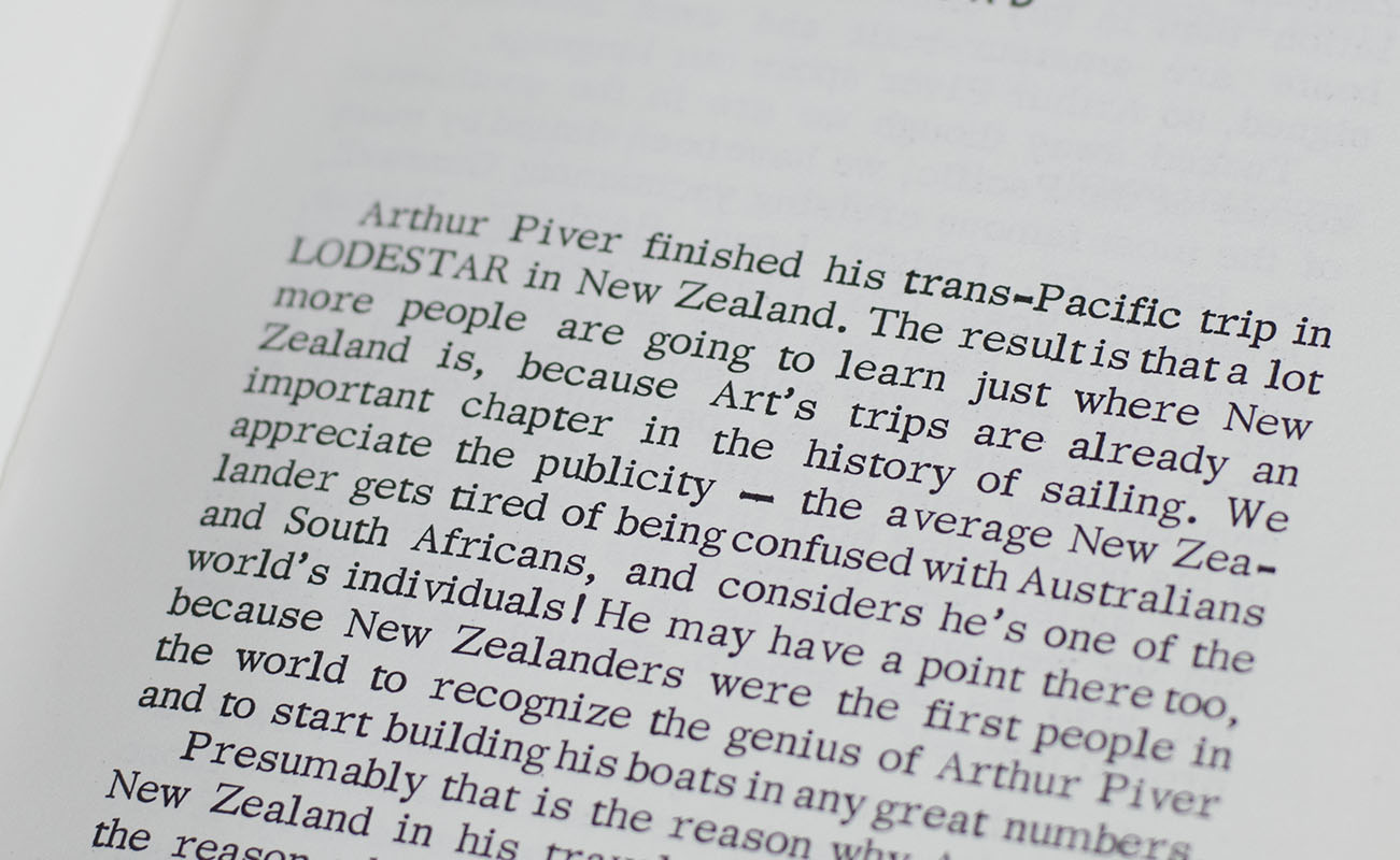 It was Arthur Piver's bang-'em-together, sheet-plywood boats that launched the modern multihull movement in the early Sixties—simultaneously setting its advancement back a dozen years. It wasn't Piver's fault that so many backyard builders erected condominiums atop his slender hulls, giving multihulls an ugly duckling reputation from which they're only now recovering" (Thomas,1985).