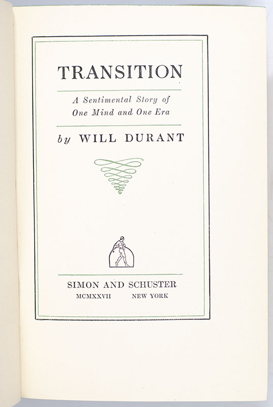 First Edition of Will Durant's Transition: A Mental Autobiography; Signed by Him