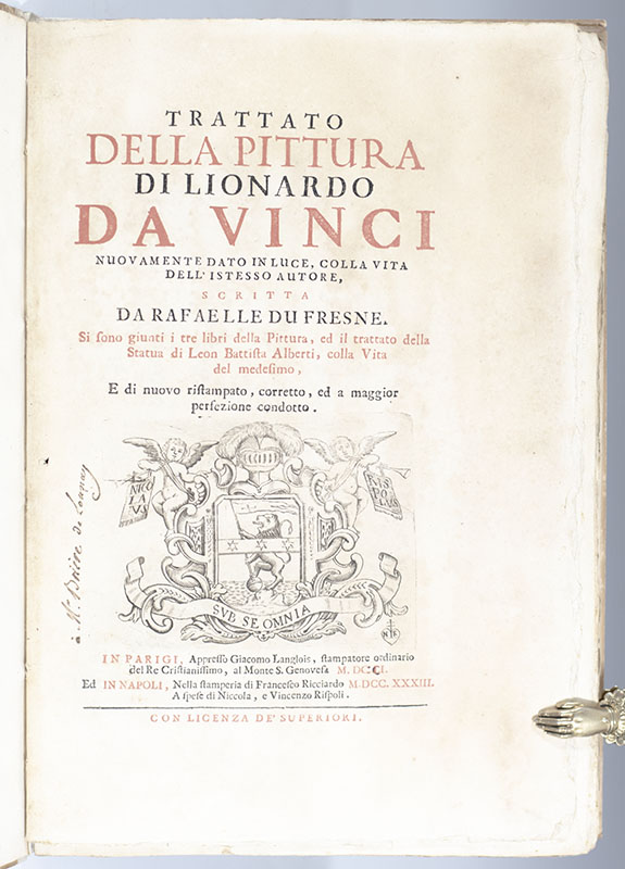 Trattato Della Pittura Di Lionardo Da Vinci Nuovamente Dato In Luce, Colla Vita Dell' Istesso Autore, Scritta Da Rafaelle Du Fresne. Si sono giunti i tre libri della Pittura, ed il trattato della Statua di Leon Battista Alberti, colla vita del medesimo, E di nuovo ristampato, corretto, ed a maggior perfezione concotto.
