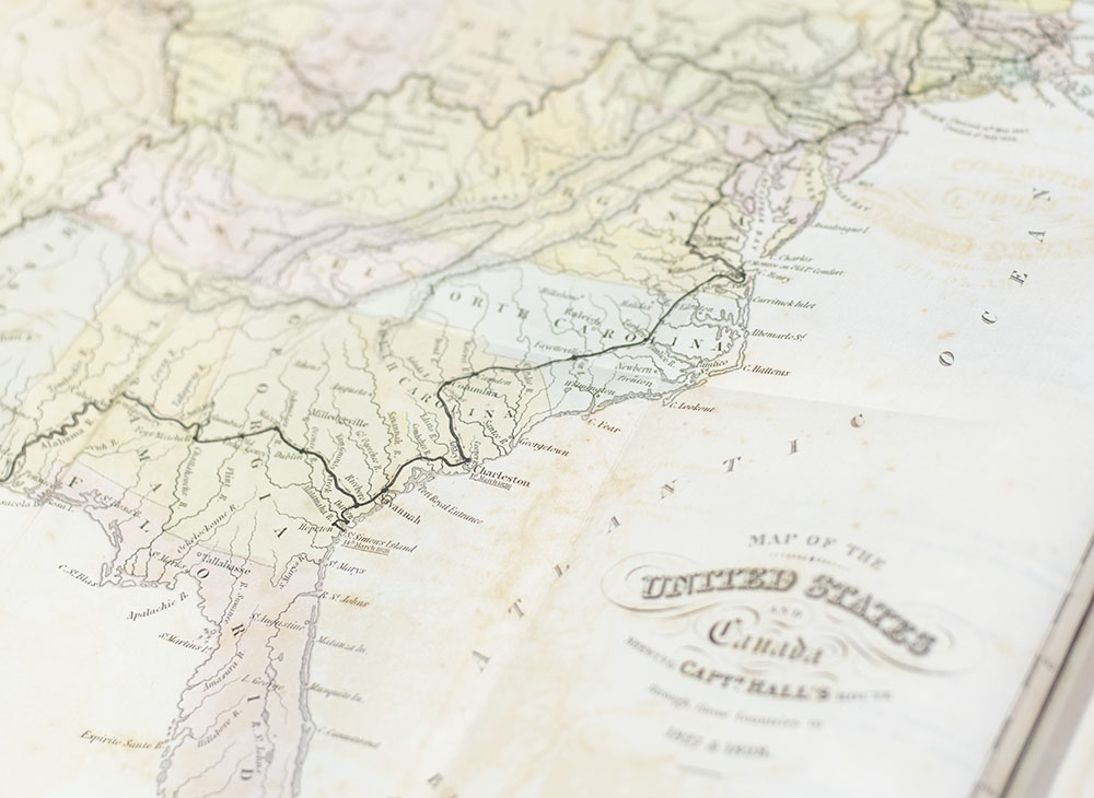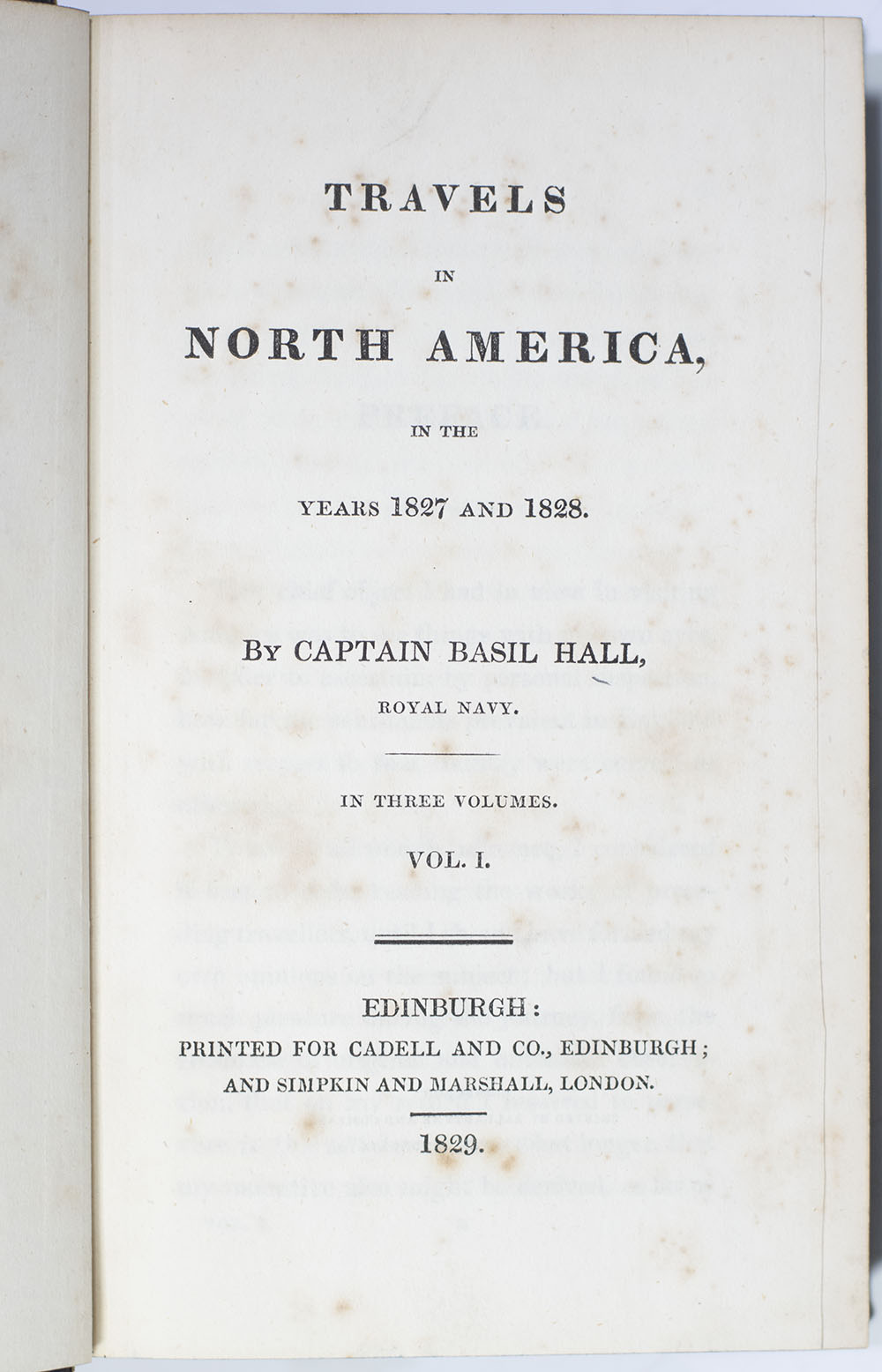 Hall was a Captain in the British Navy, who published many accounts of his travels, most notably his "Account of a Voyage of Discovery to the West Coast of Correa, and the Great Loo-Choo Island," 1818. Having resigned from the Navy in 1823, Hall spent fourteen months of 1827-1828 touring the United States and, for nine weeks, Canada. "Aided by his literary reputation and more than 100 letters of recommendation, he dined with famous people such as President John Quincy Adams, the governors of several states, and artists and academics, toured all the chief eastern rivers, including the Alabama between Montgomery and Mobile, as well as the Great Lakes, the chief canals, and the Gulf of Mexico between Mobile and New Orleans. Hall's most significant land journey was by carriage across Georgia, an adventure far different from any in the more advanced eastern states, and one that included his being feted by the Creek Indians. Altogether he claimed to have traveled 8,800 miles in the United States and Canada. "Hall's three-volume 'Travels in North America in the Years 1827 and 1828,' published in 1829 in Edinburgh and London, was one of the most widely read of over 200 such books written by British travelers to North America before the Civil War. Like all of these books, however, it was in general condemned by American readers inordinately sensitive to and defensive about any European's judgments concerning the new nation's political experiments, its classless society, and its system of slavery which, especially to Britons at the time, was becoming more and more abhorrent. Nevertheless, perhaps in part because of Hall's intent to help his countrymen 'think the Americans more worthy of regard and confidence,' perhaps in part because he was determined to learn about America only from Americans, Hall's 'Travels' was more nearly acceptable in the United States than contemporaneous accounts by Frances Trollope, Dickens, and, especially, the outspoken Marryat, another retired naval captain who visited the United States in 1837-1838. Readers today, especially Americans, will in fact find Hall's keen, detailed, and well-written observations to be both just and significant. One highly original side feature of this American journey was the collection of forty drawings Hall made with the help of the camera lucida, and which he published simultaneously with the 'Travels' in a small volume that underwent several editions. The 'Travels' itself had two more editions in its first year" (Percy Addams for ANB). Herbert Bristow Hughes (1820-1892) was the brother of John Bristow Hughes, a grazier, developer and politician in the early days of the Colony of South Australia. H. B. Hughes was born in Liverpool and went to Australia in 1841, where he formed Booyoolie Station on a tract of land on the Rocky River. The highest elevation in the hilly Booyoolie Station was named Mount Herbert after its owner and founder. Sabin 29725. Howes H-47. Clark III 48. Dionne II 1045. Lande 404.