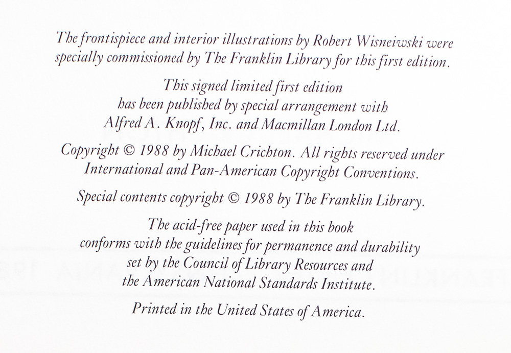 Signed limited first edition of Crichton's fourth, final, and most famous non-fiction book, privately printed exclusively for members of The Signed First Edition Society. Octavo, Smyth-sewn and bound in full top-grain leather specially processed for fine books by the Cromwell Leather Company with gilt titles and tooling to the spine in four compartments within raised bands, gilt decoration to the front and rear panels, all edges gilt, silk ribbon laid in, marbled endpapers, frontispiece and interior illustrations by Robert Wisneiwski specially commissioned by The Franklin Press for this first edition. Signed by the author on the front flyleaf. In fine condition.