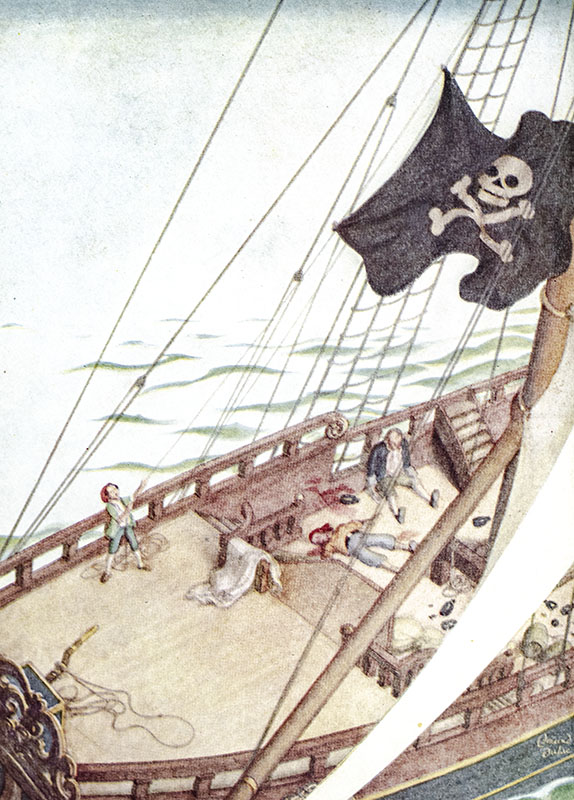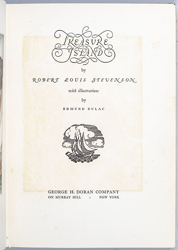 First edition of Edmund Dulac's magnificent illustrated interpretation of Robert Louis Stevenson's Treasure Island. Quarto, original cloth, pictorial endpapers, illustrated by Edmund Dulac with 12 tipped-in plates in full color and numerous black and white illustrations throughout. Very good in the rare original dust jacket which is in very good condition. Jacket illustration by Dulac. Rare and desirable.