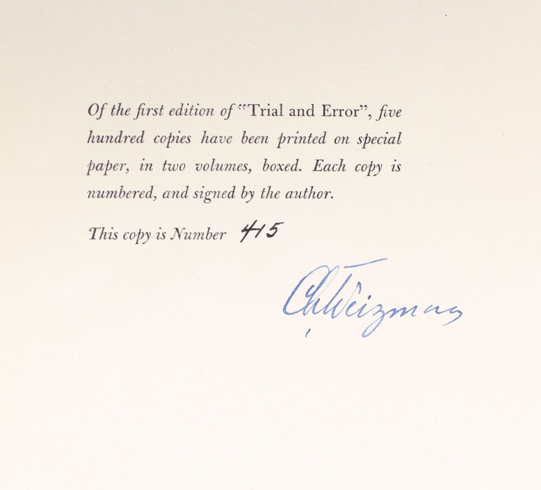 “THE MOST AUTHORITATIVE FIGURE IN JEWISH LIFE”: SIGNED LIMITED EDITION OF CHAIM WEIZMANN’S AUTOBIOGRAPHY TRIAL AND ERROR