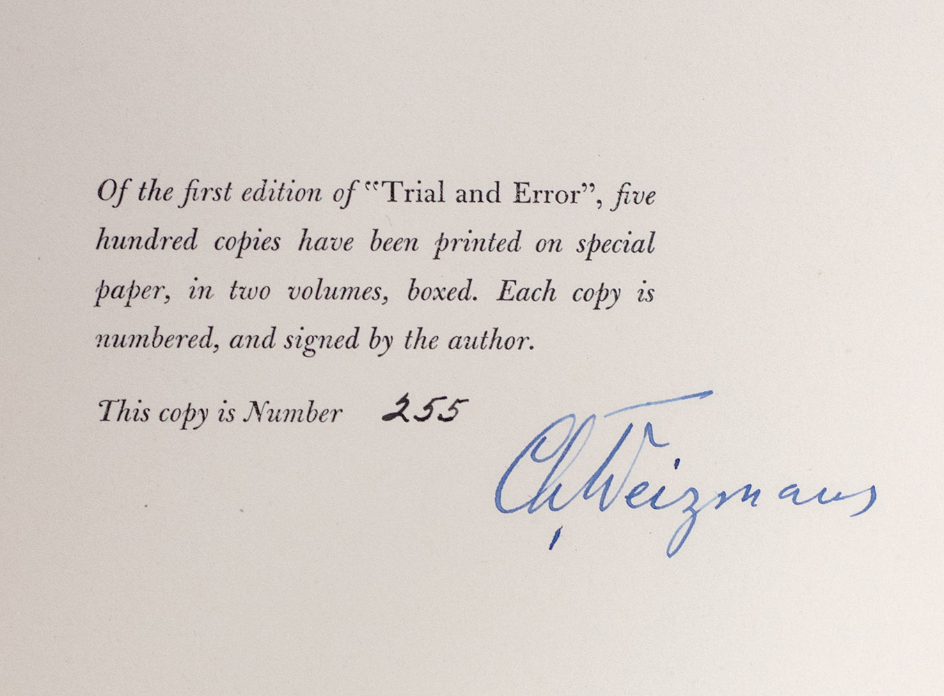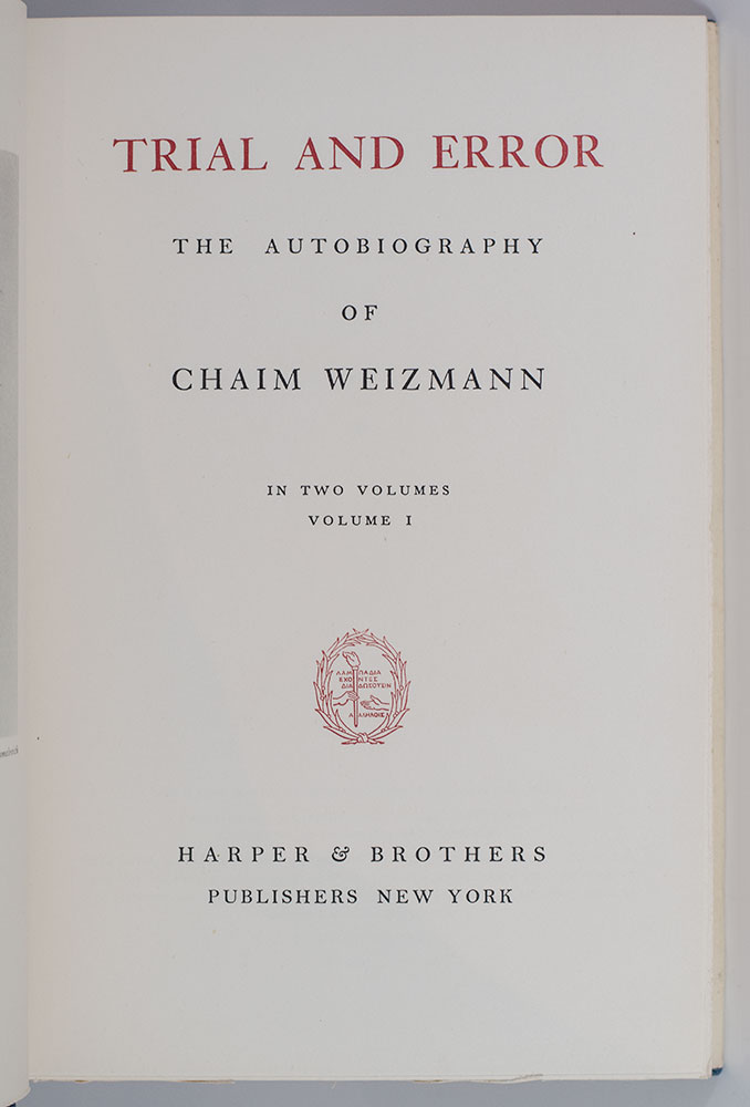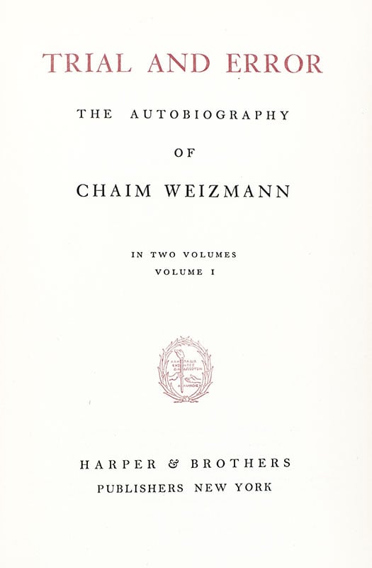 “THE MOST AUTHORITATIVE FIGURE IN JEWISH LIFE”: SIGNED LIMITED EDITION OF CHAIM WEIZMANN’S AUTOBIOGRAPHY TRIAL AND ERROR