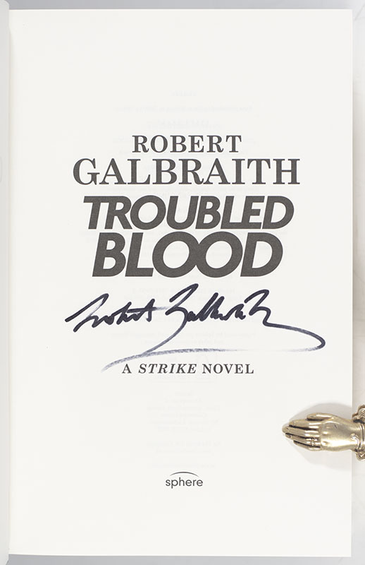 First edition of the fifth novel in the Cormoran Strike series, written by J. K. Rowling and published under the pseudonym Robert Galbraith. Octavo, original cloth. Signed by the author on the title page, "Robert Galbraith." With Rowling's hologram sticker to the verso of the half-title page. Fine in a fine dust jacket. Jacket design by Duncan Spilling. One of only 50 purportedly signed examples.