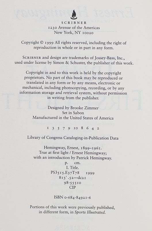 First edition of Ernest Hemingway's True at First Light