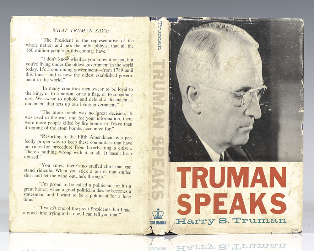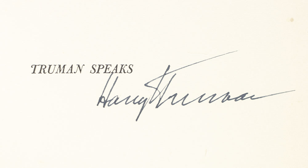 First edition of a collection of lectures given by Truman at Columbia University. Octavo, original cloth, frontispiece of Truman. Boldly signed by Harry Truman on the half-title page. Near fine in a very good dust jacket. Jacket photograph by The Bettmann Archive.