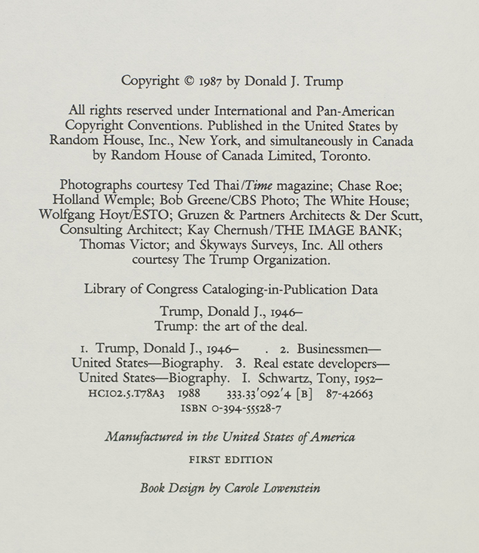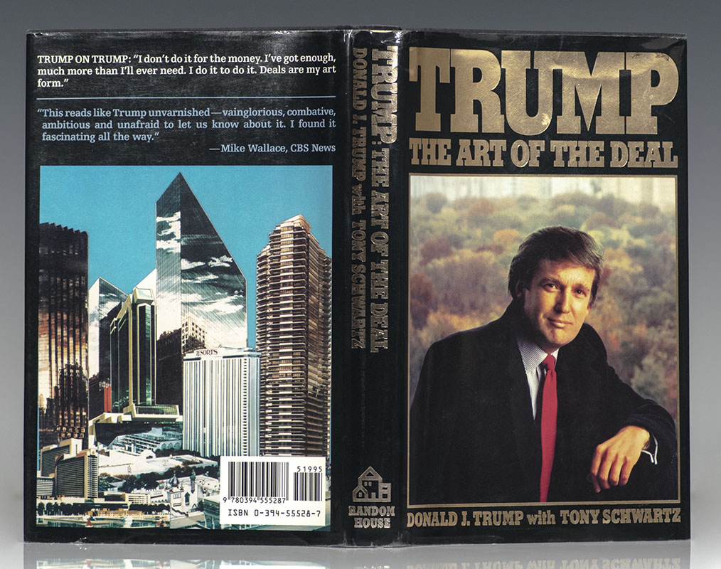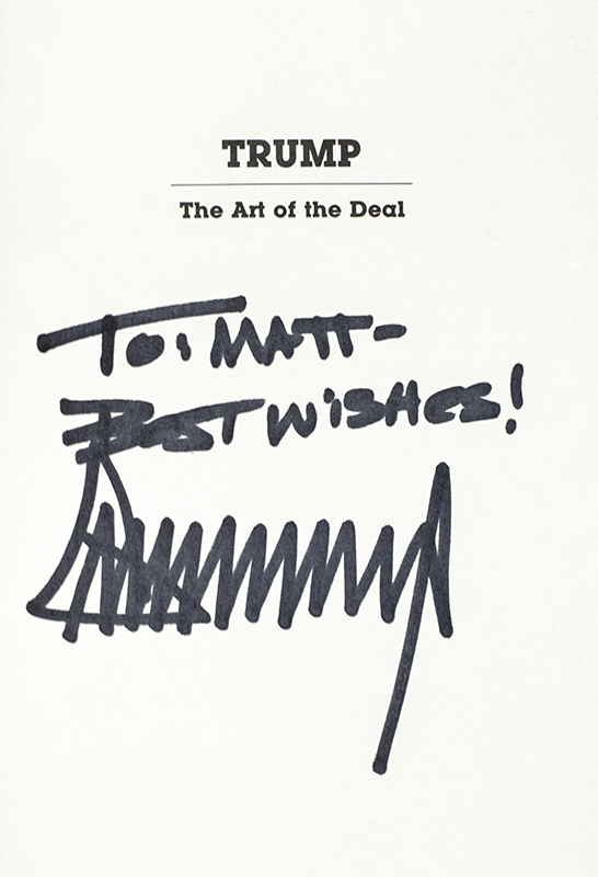 First edition of Trump's first book. Octavo, original half cloth, illustrated. Presentation copy, inscribed by the author on the half-title page, "To Matt Best Wishes! Donald J. Trump." Fine in a fine dust jacket. Jacket design by Robert Aulicino. Jacket photograph by Michele Singer.