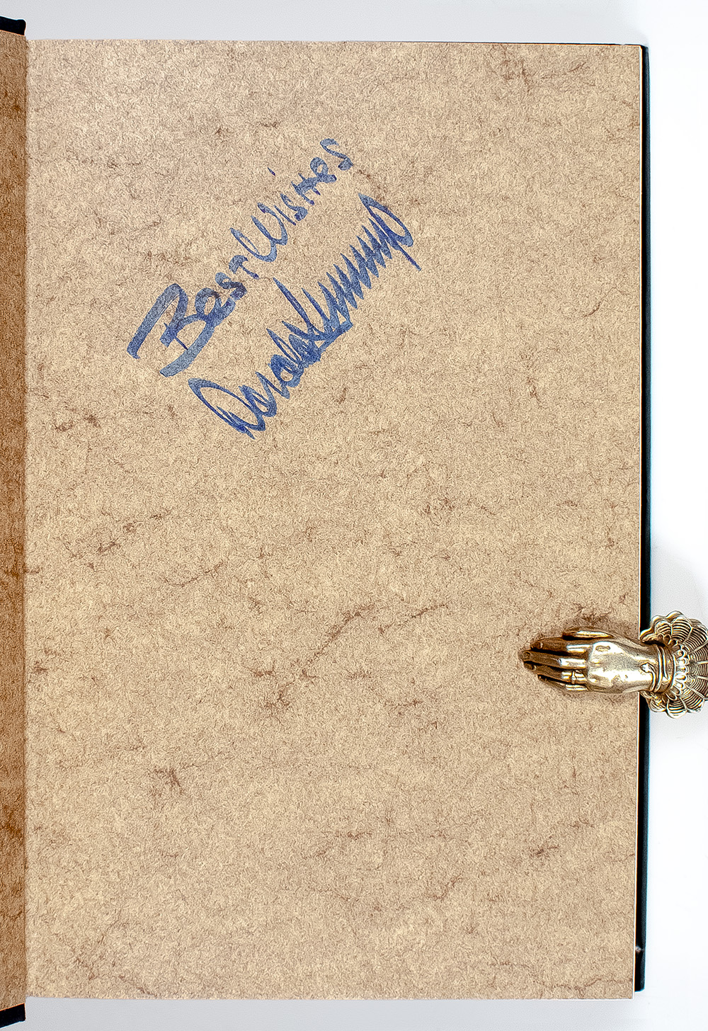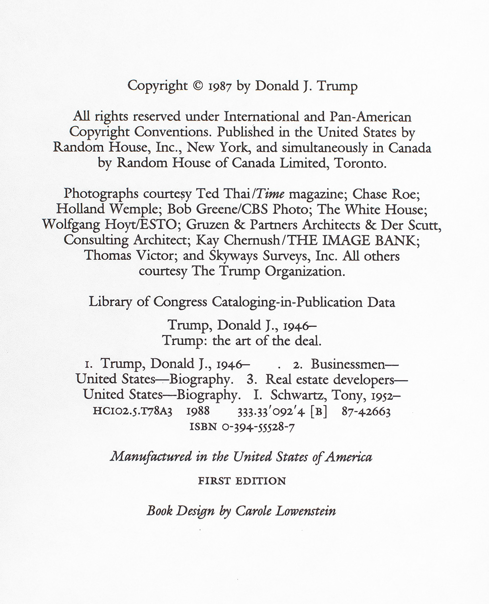 First edition of Trump's first book. Octavo, original half cloth, illustrated. Boldly signed by the author on the front free endpaper, "Best Wishes- Donald J. Trump." Fine in a fine dust jacket. Jacket design by Robert Aulicino. Jacket photograph by Michele Singer.