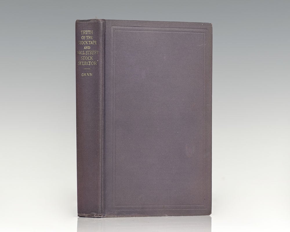 First edition of this work by Gann, based on his years as a seasoned trader. Octavo, original cloth, frontispiece, 19 charts. Boldly signed by W.D. Gann on the title page. In near fine condition with light rubbing. Two titles in one volume (as issued) and separately paginated. The Truth of the Stock Tape was originally published in 1923; The Wall Street Stock Selector in 1930. This is a first printing of the two volumes bound as one. This volume also contains Gann's forecast for 1929. Housed in a custom half morocco clamshell box. Books signed by Gann are rare.