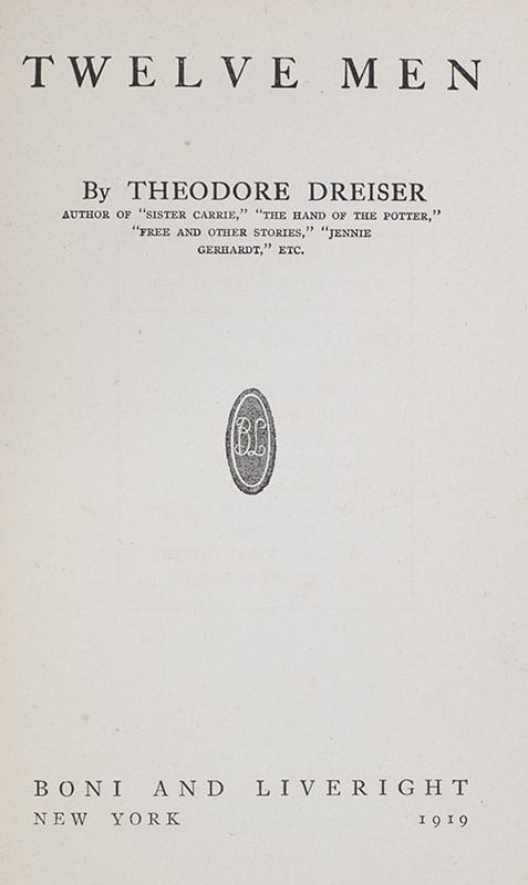 "As one drags along through this inexplicable existence one realizes how such qualities stand out": First edition of Theodore Dreiser's Twelve Men