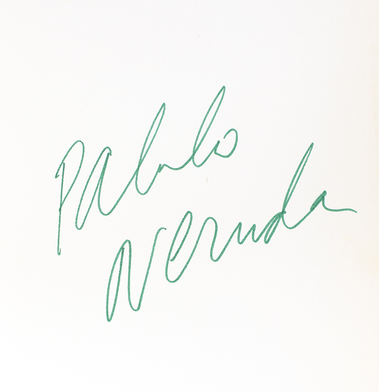 First edition of Neruda's classic work. Octavo, original cloth. Boldly signed by Pablo Neruda on the front free endpaper. Fine in a very good dust jacket. Translated by Robert Bly and James Wright.
