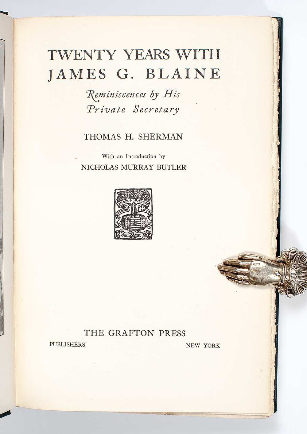First edition of this biography of American statesman, Republican politician, and Secretary of State, James G. Blaine, from the observations of his private secretary; from the library of Philemon Tecumseh Sherman. Octavo, original cloth, frontispiece portrait of James G. Blaine, illustrated with black and white photographs. P. T. Sherman’s bookplate to the front pastedown beneath his ownership signature. In near fine condition. General William Tecumseh Sherman’s son P. T. Sherman was a lawyer in New York, specializing in labor and insurance, and was elected a member of the New York Board of Alderman in the late 1880s. In the early 1900s, he was appointed the New York Commissioner of Labor. He transferred his library to his niece, Eleanor Sherman Fitch, the granddaughter of General Sherman through his eldest daughter, Maria “Minnie” Ewing Sherman Fitch, before he died. Until now, the book was held at the family estate in Washington County, Pennsylvania.