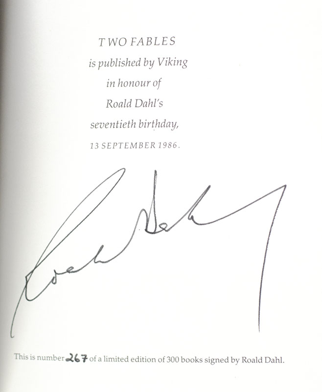 Signed limited edition of Roald Dahl's Two Fables; one of 300 copies signed by him