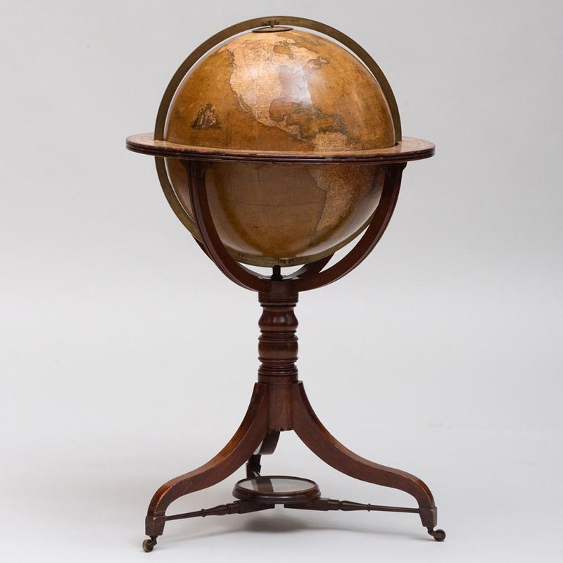 Fine pair of two large Regency period globes produced by William and Thomas M. Bardin, two of the most highly regarded globemakers of the period. Both the celestial and terrestrial globe measure 18 inches in diameter and are mounted on the original mahogany tripod stands with central compasses mounted on raised brass casters. Fitted with brass meridian rings, the terrestrial globe with an additional brass hour circle at the north pole. The horizon circles for both globes have engraved paper zodiacal rings with calendar. Each with a cartouche reading, "Sir Joseph Banks, Bart K.B., President of the Royal Society, this New British Terrestrial Globe: 1807; The Rev. Nevil. Maskelyne, D.D.F.R.S, Astronomer royal, This New British Celestial Globe c. 1800. The terrestrial globe's cartouche has additional text reading: "Containing all the latest discoveries and communications from the most correct and authentic observations and surveys to the year 1799 by Capt. Cook.. engraved from an accurate drawing by Mr. Arrowsmith, Geographer...W. & T. M. Bardin. Additions to 1807-1814." The New British celestial globe's cartouche, "Containing the positions of nearly 6000 stars, clusters, nebulae, planetary nebulae & c., correctly laid down to the present period from the latest observations. W. 7 T. Ma. Bardin." In near fine condition. The terrestrial globe has some older restorations and minor losses and a repair to the horizon band. The celestial globe with minor age cracks on the north pole with minor restorations. Compass needles and paper in facsimile. Exceptionally rare. Paired examples of Bardin's 18 inch globes are almost never offered on the market, particularly with the original tripod stands. A similar pair can be seen at the Smithsonian Museum in Washington, D.C.
