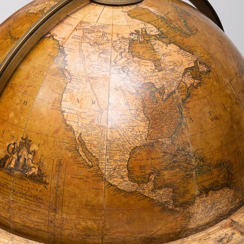 William Bardin and his son Thomas M. Bardin were important globe and instrument makers in the late 18th century. Both were professional cartographers and their globes show an elegance and style often lacking in their English competition. Bardin's 18 inch globes were the largest produced by this distinguished firm, and were among the finest globes available in the period, introduced in 1798. New revised editions were published until at least the 1820s. All editions were offered with a choice of furniture styles, of which those with mahogany floor stands, such as these were the most luxurious. The geography of the terrestrial globe was largely taken from the work of Aaron Arrowsmith, the most accomplished mapmaker of the early 19th century; his North American geography greatly influenced Lewis and Clark. The discoveries of Hearne, Mackenzie, Cook and other great explorers of the preceding decades are also shown in detail.