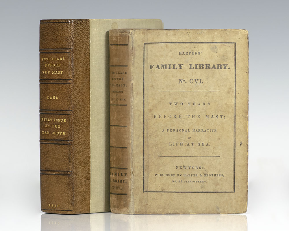 First edition, first issue of Dana’s record of his maritime travels in the 1830s from Boston to California and back—“our only trustworthy account before the 1849 Gold Rush.” 12 mo, original publisher's printed tan muslin cloth. Housed in a custom chemise and morocco box. First issue with dot over the "i" in the word "in" on copyright page, and the unbroken running head on page 9. First state of BAL's binding type 'B' with list of title in the Harper's Family Library ending at number 105. In near fine condition, rebacked. Scarce and desirable.