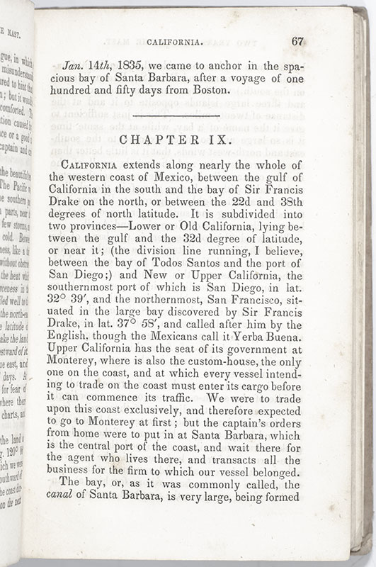 “One of the first and freshest, because of its plain factual nature, of American accounts of the sea, the book has added importance because, while the brig was assembling hides for the return trip to Boston, Dana journeyed up into the California cattle country, of which he gives us our only trustworthy account before the 1849 gold rush” (Grolier American 100 46). “Dana’s work is invaluable for its descriptions of California ranching and social life in Mexican times” (Streeter IV:2493). This authoritative account is hailed as “both literature and Americana of outstanding consequence” (Bennett, 86). "If not the most widely read book on California, certainly this ranks extremely high on such a list. The author sailed up and down the California coast, trading for hides, from January 1835, until May 1836. He possessed not only extraordinarily keen powers of observation but a fine facility for expressing his ideas in writing, which makes this volume an excellent and very readable record of his experiences" Zamorano. BAL 4434; Cowan p.156; Graff 998; Howes D49; Zamorano Eighty 26. It is the basis for the 1946 film starring Alan Ladd, Brian Donlevy, William Bendix, and Barry Fitzgerald.
