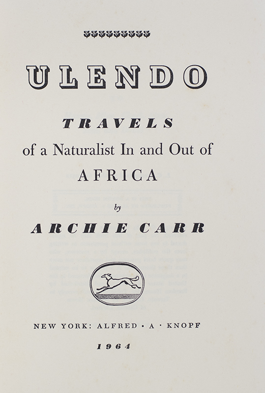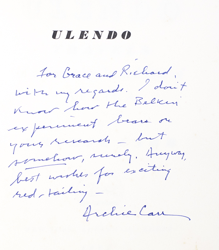 First edition. Octavo, original cloth, illustrated. Presentation copy, inscribed by the author on the half-title page, "For Grace and Richard, with my regards. I don't know how he Belkin experiment bears on your research- but somehow, surely. Anyway, best wishes for exciting researching. Archie Carr." Near fine in a near fine price-clipped dust jacket. Jacket design by Howard Morris.