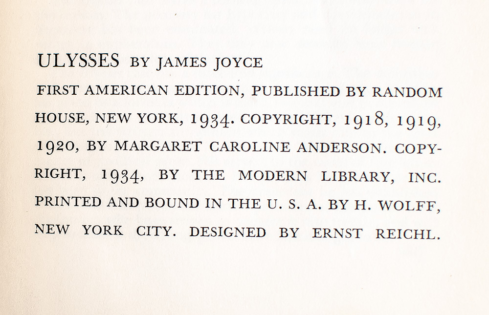 "Within a month of the publication, the first printing of Ulysses [Shakespeare and Company, Paris, 1922] was practically sold out, and within a year Joyce had become a well-known literary figure. Ulysses was explosive in its impact on the literary world… Then began the great game of smuggling the edition into countries where it was forbidden, especially England and the United States. The contraband article was transported across the seas and national borders in all sorts of cunning ways" (de Grazia, 27). In this edition, the text of Joyce's great work is preceded by a foreword, synopsis of the District Court decision, and letter from Joyce to his publisher, Bennett Cerf, all discussing the extraordinary controversy surrounding the book's publication. In 1929 an unauthorized American edition of the novel appeared, a piracy of the legitimate ninth printing of Shakespeare and Company. "This Random House edition was set up from the text of a copy of that [pirated] edition, incorporating most of its typographical errors and adding a few new ones" (Slocum A21). The United States' ban on Ulysses was not lifted until December 6th, 1933; one month later the first authorized American edition was delivered to the public. Joyce's "novel is universally hailed as the most influential work of modern times" (Grolier Joyce 69). Named by Modern Library as one of the 100 greatest novels of the 20th century.