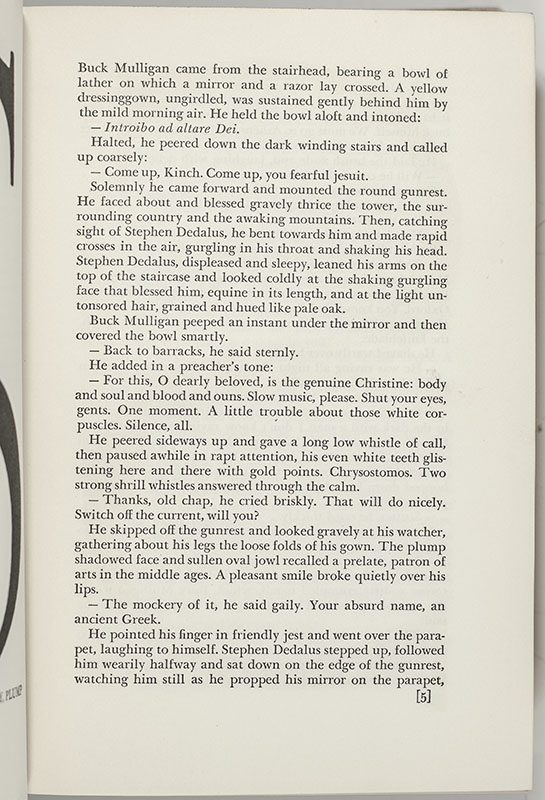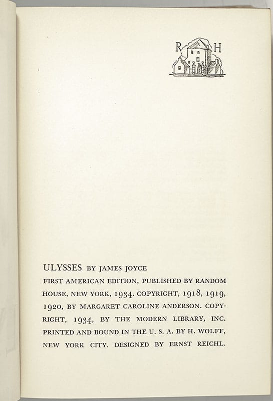 "Within a month of the publication, the first printing of Ulysses [Shakespeare and Company, Paris, 1922] was practically sold out, and within a year Joyce had become a well-known literary figure. Ulysses was explosive in its impact on the literary world… Then began the great game of smuggling the edition into countries where it was forbidden, especially England and the United States. The contraband article was transported across the seas and national borders in all sorts of cunning ways" (de Grazia, 27). In this edition, the text of Joyce's great work is preceded by a foreword, synopsis of the District Court decision, and letter from Joyce to his publisher, Bennett Cerf, all discussing the extraordinary controversy surrounding the book's publication. In 1929 an unauthorized American edition of the novel appeared, a piracy of the legitimate ninth printing of Shakespeare and Company. "This Random House edition was set up from the text of a copy of that [pirated] edition, incorporating most of its typographical errors and adding a few new ones" (Slocum A21). The United States' ban on Ulysses was not lifted until December 6th, 1933; one month later the first authorized American edition was delivered to the public. Joyce's "novel is universally hailed as the most influential work of modern times" (Grolier Joyce 69). Named by Modern Library as one of the 100 greatest novels of the 20th century.