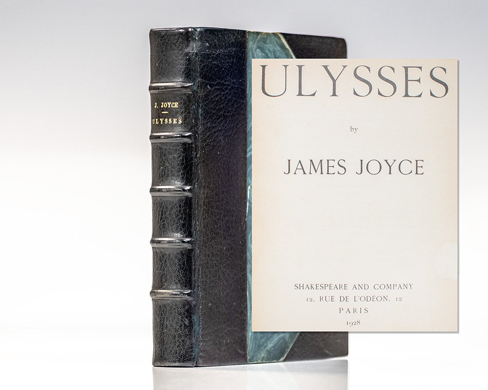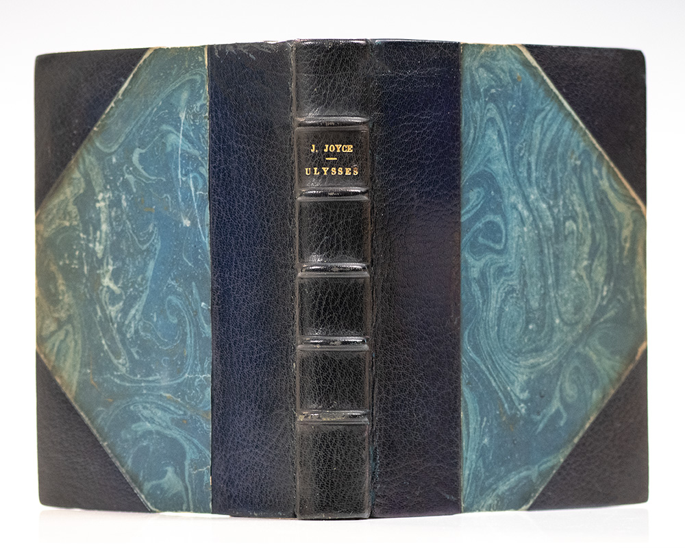 Finely bound example of Joyce's masterpiece, the final edition published by Shakespeare and Company. Octavo, bound in three quarter period levant navy morocco over marbled boards with gilt titles and five raised bands to the spine, marbled endpapers, ribbon bound in, top edge gilt, retaining the original blue and white wrappers. In very good condition, ownership inscriptions to the endpapers bound in before the original wrappers.