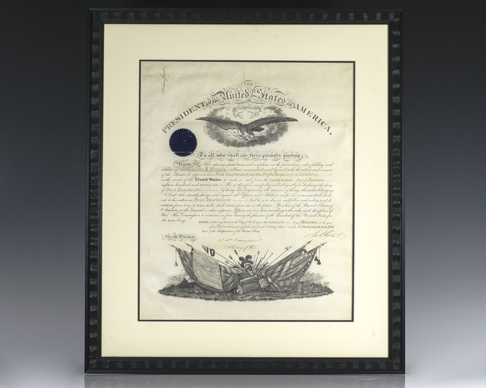 Autograph military commission boldly signed by President Ulysses S. Grant, dated December 20th 1876. One page partially printed on vellum and retaining the original blue seal, the commission appoints Alexander L. Morton as First Lieutenant in the Fifth Regiment of Artillery in the service of the United States. Signed by Grant at the conclusion and countersigned by Secretary of War J. Donald Cameron and Adjutant General Edward D. Townsend. Double matted and framed. The entire piece measures 26.5 inches by 22.5 inches. In fine condition.