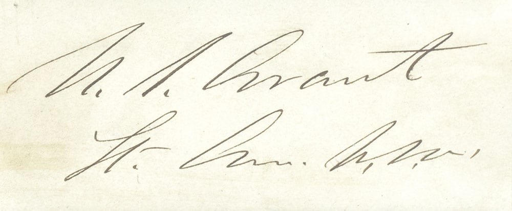 Autograph boldly signed "U.S. Grant, Lt. Gen.” on a card. Double matted and framed with a photograph of Grant. The entire piece measures 12.5 inches by 8.5 inches. In fine condition.