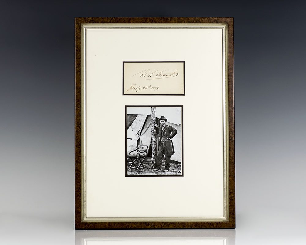 Autograph boldly signed and dated "U. S. Grant July 28th, 1881." In fine condition. Double matted and framed with a photograph of Grant. The entire piece measures 13.25 inches by 18 inches.