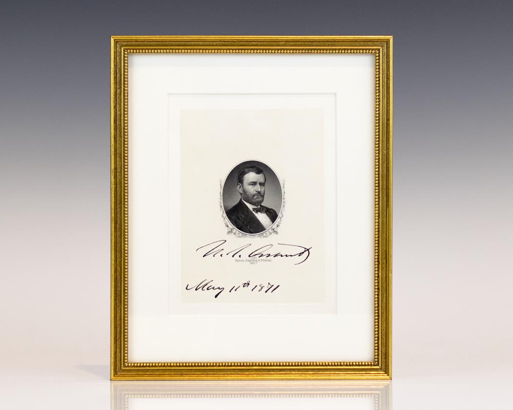 Portrait engraving of President Ulysses S. Grant. Boldly signed "U.S. Grant May 11th 1871." The engraving measures 4 inches x 5.5 inches. Grant was serving in his first term as the eighteenth president of the United States when he signed this portrait engraving produced by the U.S. Bureau of Engraving and Printing. In fine condition. Matted and framed. Total piece measures 8" x 10". Engravings signed by Grant are rare, especially signed during his Presidency.