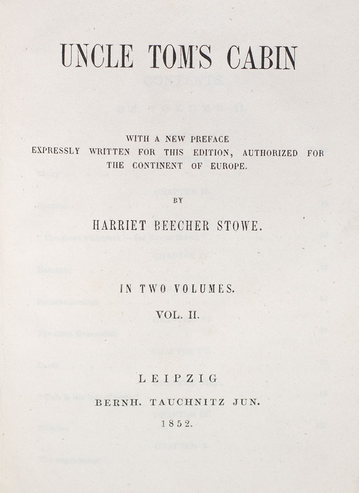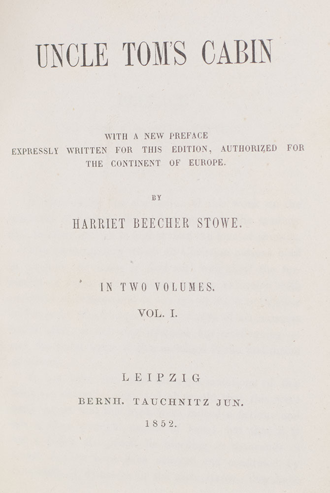 First Continental edition of Stowe’s enormously influential work, widely considered the book that precipitated the American Civil War. 12mo, 2 volumes bound in full cloth. This Tauchnitz edition, authorized for the Continent of Europe, was published the same year as the American edition, with the author's preface dated September 21, 1852. In very good condition.