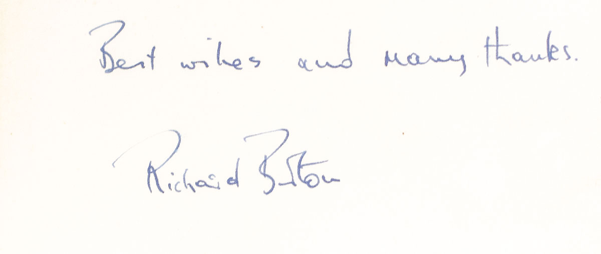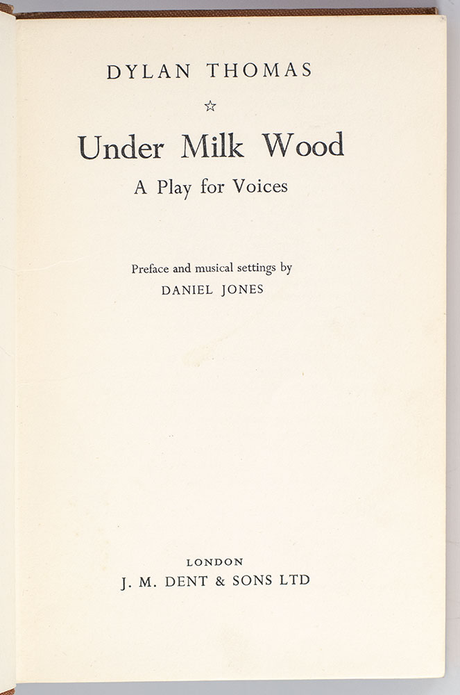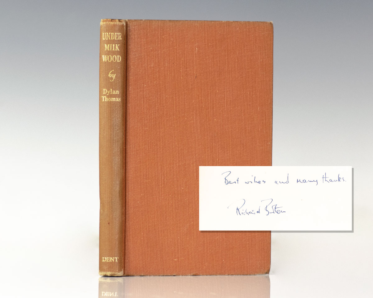 First edition of Thomas's classic drama. Octavo, original cloth. Presentation copy, inscribed by actor Richard Burton on the front free endpaper, "Best wishes and many thanks Richard Burton." Burton famously voiced the First Voice in the BBC 1954 production. In good condition. Rare signed by Burton.