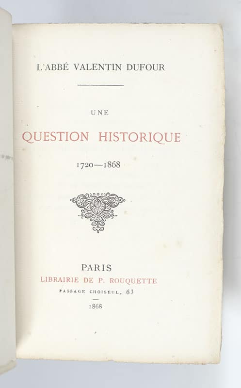 First edition of L'Abbe Valentin Dufour's Une Question Historique 1720-1868; in the rare original glassine