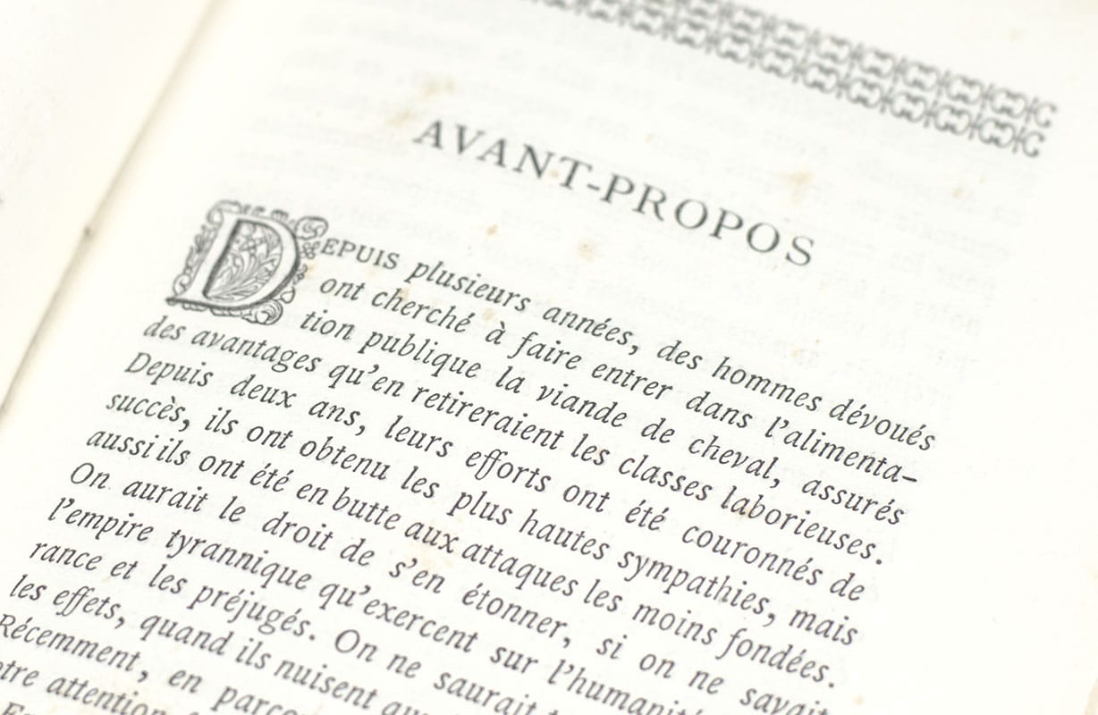 First edition of L'Abbe Valentin Dufour's historic dissertation on the consumption of horseflesh. Duodecimo, original wrappers as issued, engraved initials. In near fine condition, in the rare original glassine.