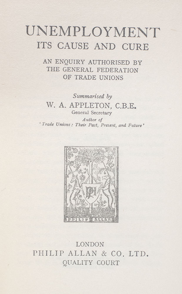First edition of W.A. Appleton's Unemployment: Its Cause and Cure; from the library of John Philip Frey