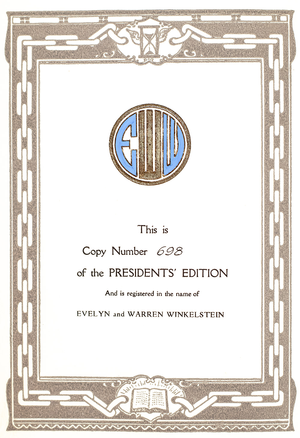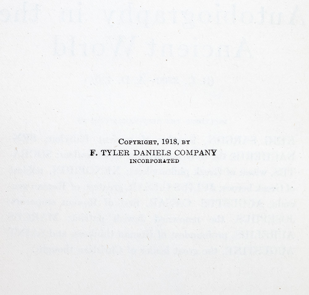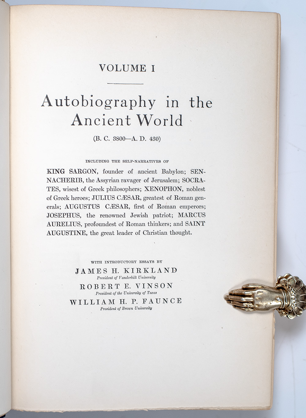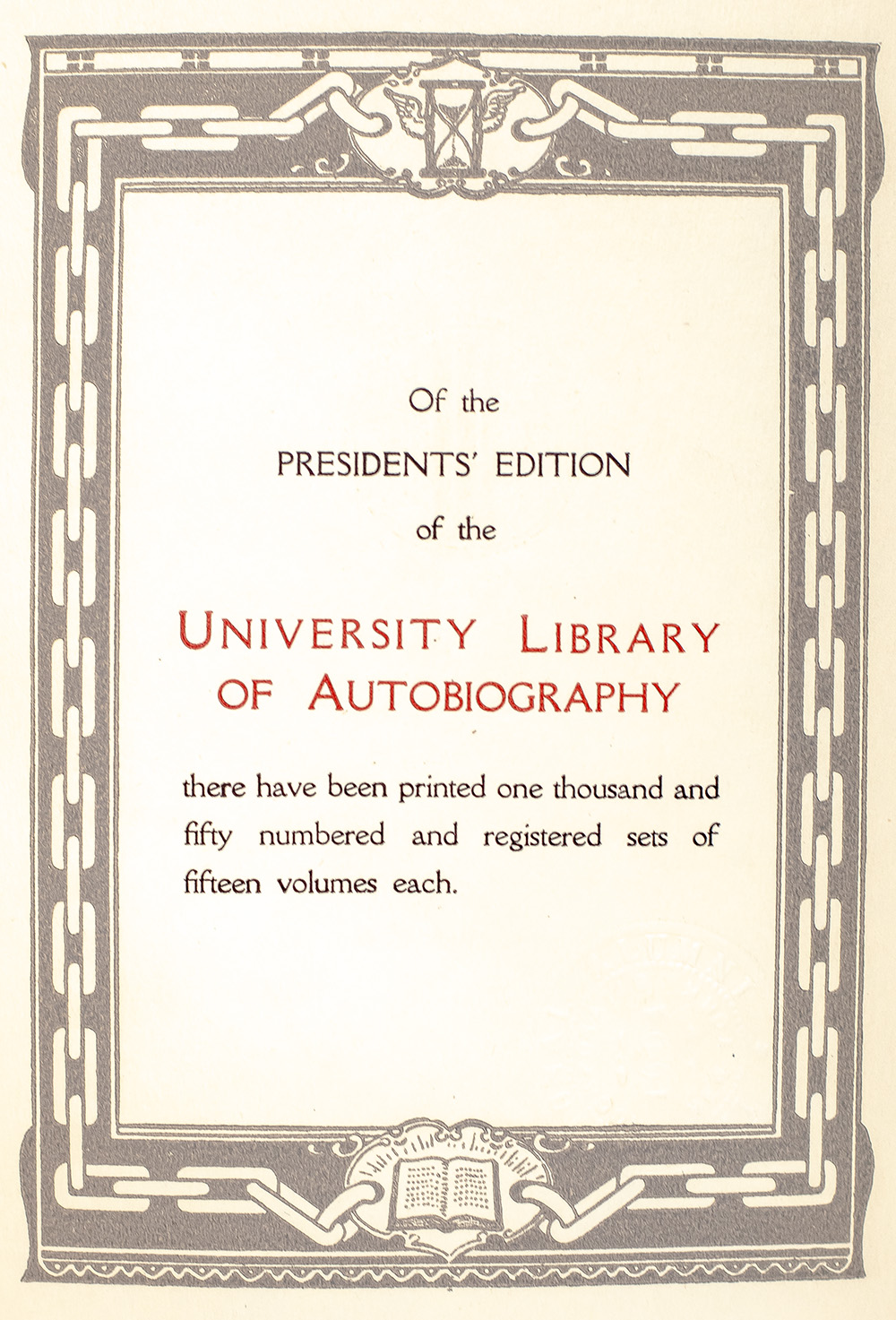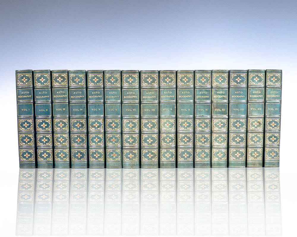The Presidents' edition of the University Library of Autobiography, including self-narratives of political figures and authors through the ages, beginning with King Sargon of Babylon and ending with Leo Tolstoy and Oscar Wilde. Octavo, 15 volumes bound in three quarter morocco with gilt titles and tooling to the spine in six compartments within raised gilt bands, marbled endpapers, top edge gilt, illustrated with tissued-guarded portraits of each featured historical figure. One of one thousand and fifty numbered and registered copies of the Presidents' edition, this is number 698, registered to Evelyn and Warren Winkelstein. In very good condition. A very attractive set.