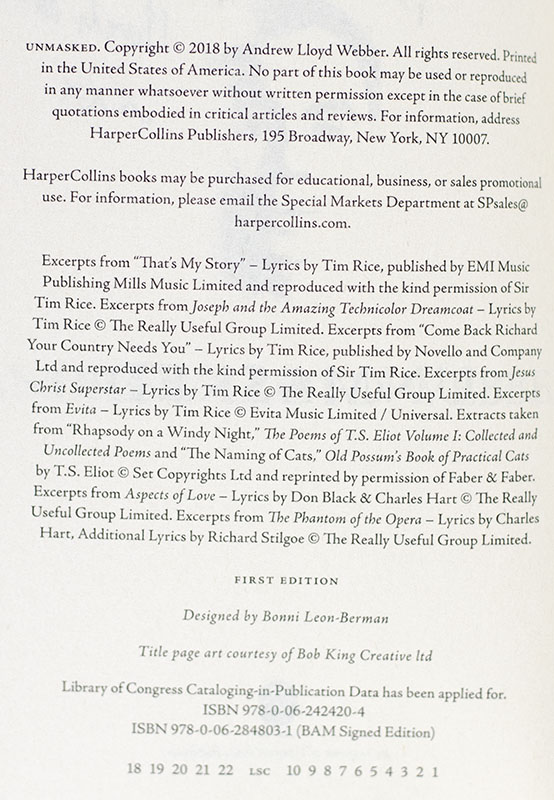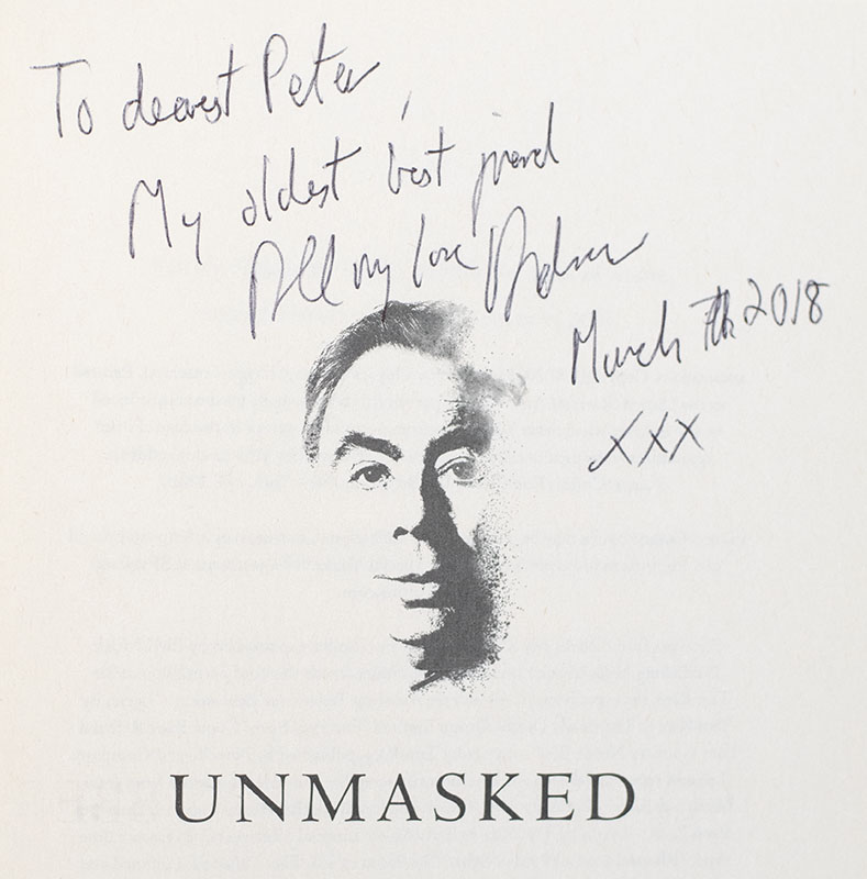 First edition of Andrew Lloyd Webber's Unmasked; inscribed by him