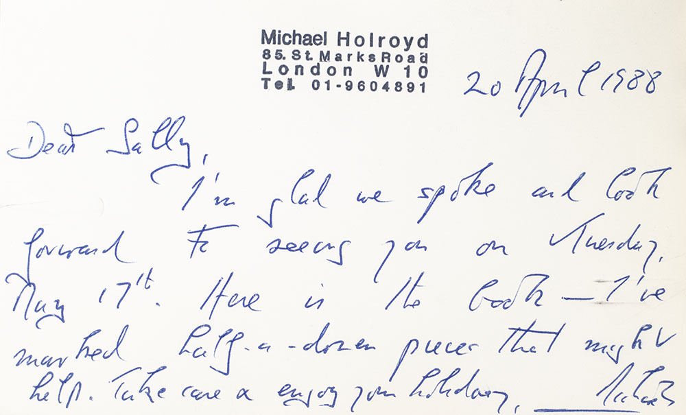 First edition of the award-winning biographer's collection of literary essays. Octavo, original cloth. Association copy, inscribed by the author on the title page, "For Sally with love M Holroyd." The recipient, British photojournalist Sally Soames, worked for The Sunday Times from 1968 until 2000 and was highly regarded for her exclusively black and white portraits of many of the most prominent figures of the 20th century including Menachem Begin, Margaret Atwood, Margaret Thatcher, Sean Connery, Rudolf Nureyev, Alec Guinness and Andy Warhol. Soames, who was known to be a warm and personal journalist, performed extensive research on the subjects of her photographs and developed intimate rapports with them during her process resulting in intimate and revealing portraits. In addition to the several world leaders Soames came to know and photograph, she captured the creative energy and personality of some of the world’s most gifted authors, poets, and playwrights. She published two books of photographs during her lifetime, Manpower (1987) with text by Robin Morgan and an introduction by Harold Evans and Writers (1995) with a preface by Norman Mailer. With an additional autograph notecard signed by the author to Soames laid in. Near fine in a very good dust jacket.