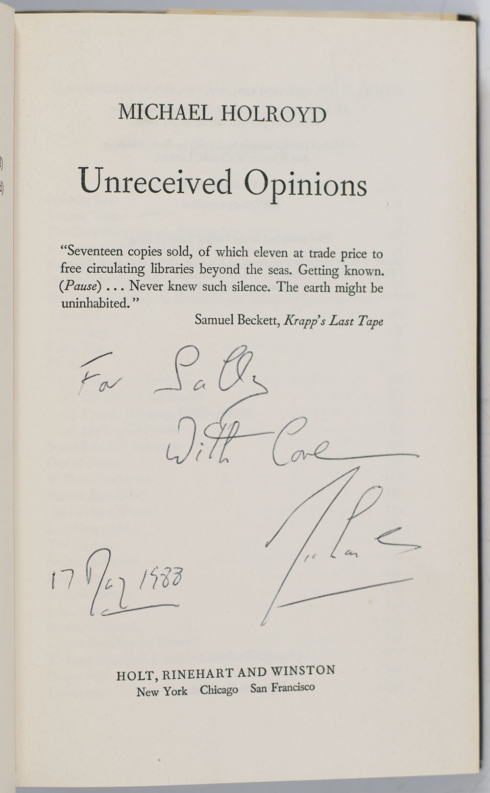 First edition of Michael Holroyd's Unreceived Opinions; inscribed by him to photographer Sally Soames