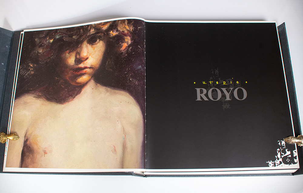 First edition of this luxury art monograph celebrating Royo’s artistic world. Folio, original publisher's pictorial boards with magnetic fore-edge closure, profusely illustrated with high-quality reproductions of Royo’s signature Mediterranean scenes. Presentation copy, inscribed by the author on the second free endpaper, "Para Gregorio y Kay Garcia con amistad Royo Nov. 2012." One of 500 numbered copies, this is number 148. Accompanied by a presentation letter in a black envelope stating the number of the copy and signed by Royo laid in. In very good condition with splitting of the text block from the spine. Translated by Kenn Richardson. Photographs by Juan Garcia Rosell, Santiago Miquel, and Archivo Royo.