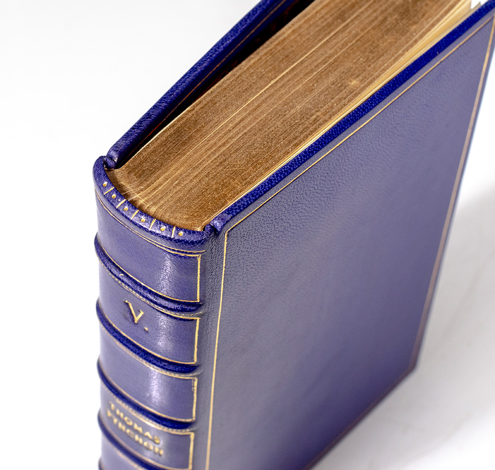 First edition of Pynchon's classic first book. Octavo, bound in full morocco by the Harcourt Bindery, gilt titles and tooling to the spine in six compartments within raised gilt bands, gilt ruling to the front and rear panels, gilt inner dentelles stamp-signed by the Harcourt Bindery, marbled endpapers, all edges gilt. In fine condition.