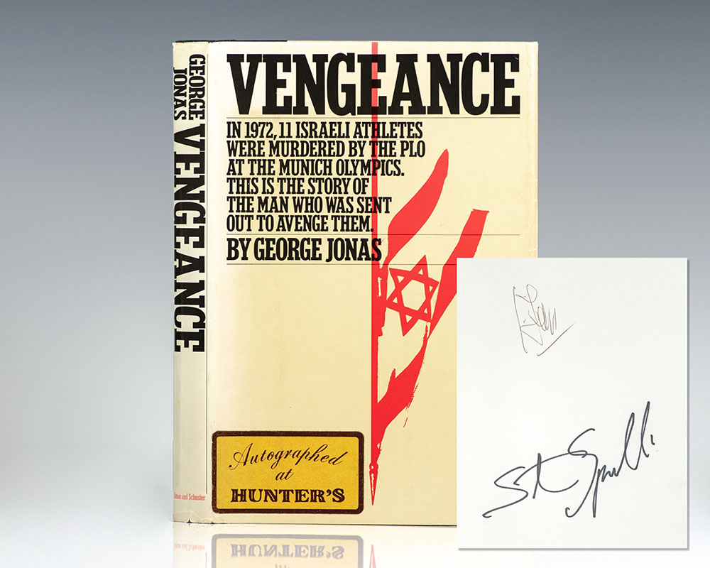 First edition of the book that inspired the Steven Spielberg film Munich. Octavo, original half cloth, illustrated. Signed by George Jonas and Steven Spielberg on the front free endpaper. The film Munich produced and directed by Steven Spielberg and written by Tony Kushner and Eric Roth. It is based on the book Vengeance, an account of Operation Wrath of God, the Israeli government's secret retaliation against the Palestine Liberation Organization after the Munich massacre at the 1972 Summer Olympics. It received five Academy Awards nominations: Best Picture, Best Director, Best Adapted Screenplay, Best Editing and Best Score. In 2017, the film was named the sixteenth "Best Film of the 21st Century So Far" by The New York Times. Name opposite the title page, near fine in a near fine dust jacket. Jacket design by Lawrence Ratzkin.
