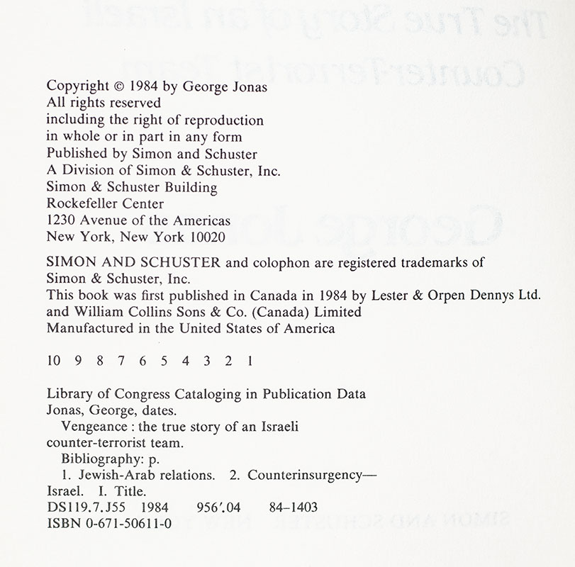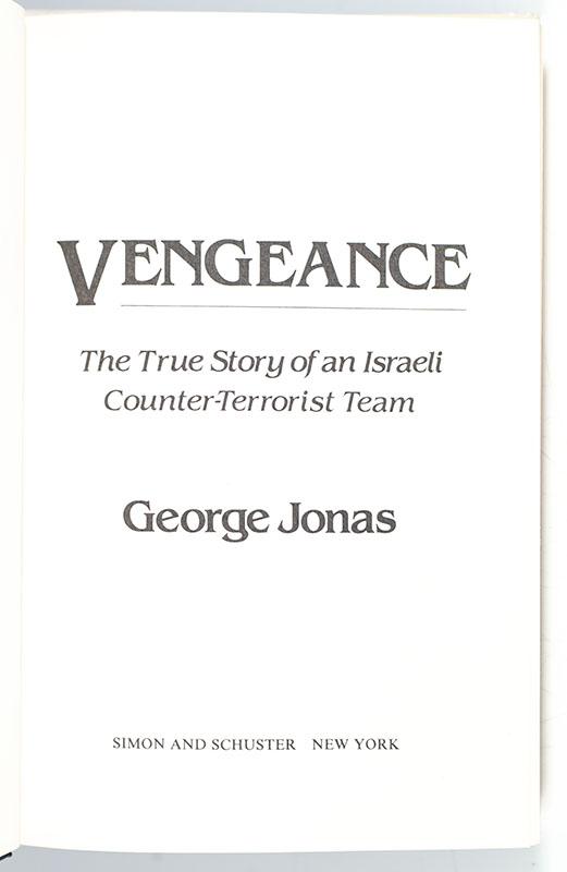 First Edition of Vengeance: The True Story of an Israeli Counter-Terrorist Team; Signed by George Jonas and Steven Spielberg